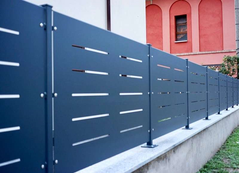 Le specchiature delle recinzioni Kansas Righe, sono realizzate utilizzando una robusta lamiera in acciaio di spessore pari 2 mm, dotata di pieghe longitudinali sia sull’estremita` superiore che inferiore, al fine di accentuarne la robustezza. Zincate e verniciate a polveri termoindurenti, sono progettate per resistere alla spinta del vento di “ZONA 2”. Esse garantiscono la pressoche` totale copertura alla vista e pertanto sono la soluzione ideale per chi e` alla ricerca della privacy. Le strette fessure presenti sul pannello rendono la soluzione prestigiosa ed elegante.